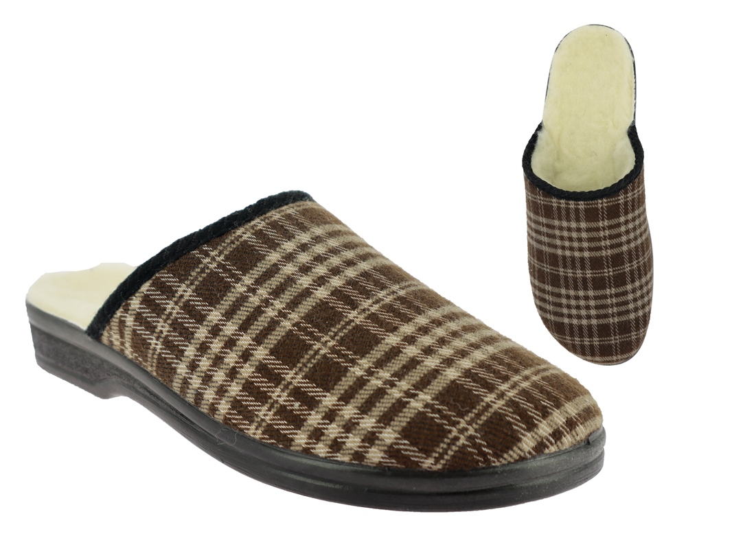 .He.-Pantoffel, schwarze PU-Sohle, Warmfutter, 50% Wolle/Rest Synthetik, kariert, Textil, braun